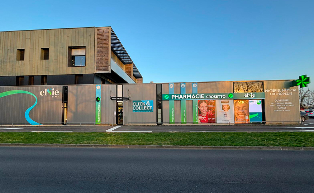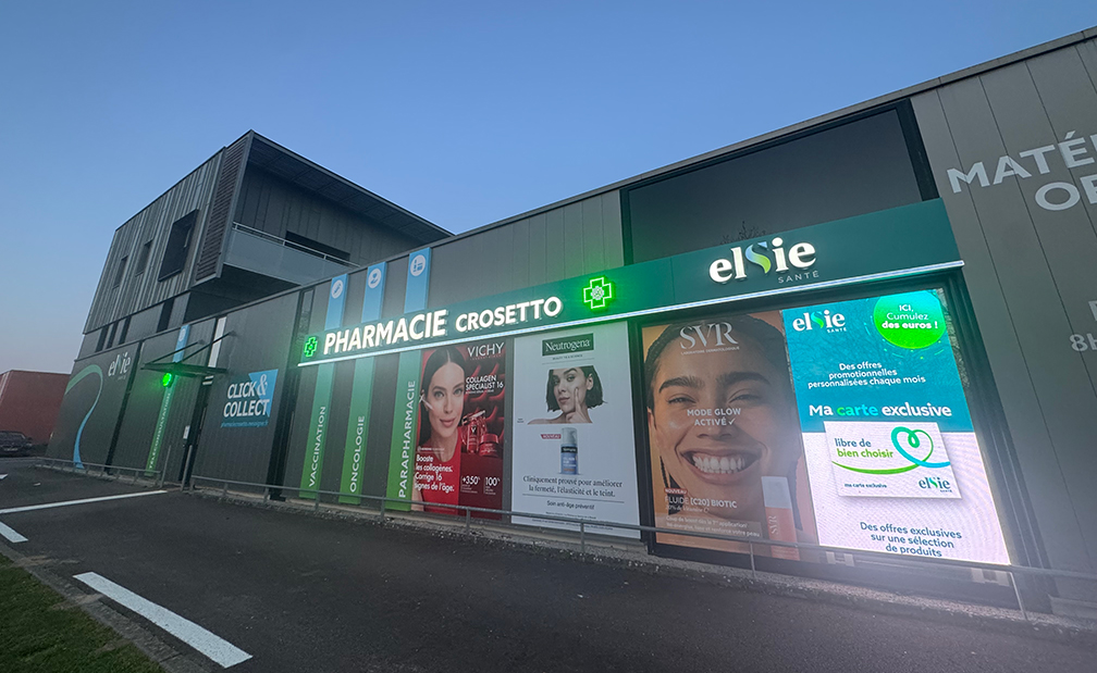 - Lot en impression numérique sur 4 colonnes existantes, ligne de vie, logo ELSIE SANTE et CLICK&COLLECT (sur support d’enseignes à plat en aluminium composite)